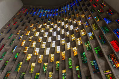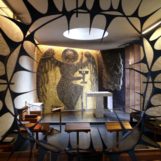 An almost separate, circular space with glass walls and a central altar, the Chapel of Christ the Servant allows those inside and in worship, to see the world outside and be part of it. Indeed, this chapel is also known as the Chapel of Industry, because the surrounding buildings used all to be industrial (and thus the focus of bombing raids). Around the plinth of the altar are engraved Christ's words: "I am among you as one that serves" (Luke 22:27).