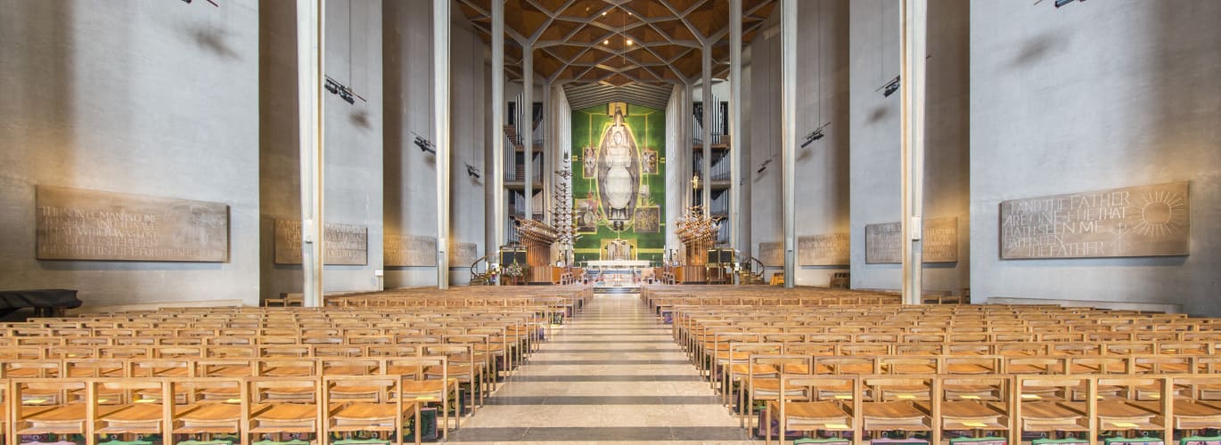 As well as housing the stunning Baptistery window, the Nave features five pairs of 25 metre high windows which reflect man's journey through life. The idea for the angled pairs of windows came to Basil Spence in a dream whilst he was being treated for an abscess in a dentist's chair. The windows were designed by three gifted young designers from the Royal College of Art – Keith New, Geoffrey Clarke and their tutor Lawrence Lee – and work began on the glass in 1953.