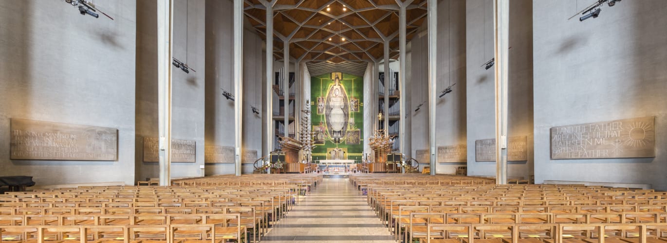 The interior is notable for its huge tapestry (once thought to be the world's largest) of Christ, designed by Graham Sutherland, the emotive sculpture of the Mater Dolorosa by John Bridgeman in the East end, and the Baptistry window designed by John Piper (made by Patrick Reyntiens), of abstract design that occupies the full height of the bowed baptistery, which comprises 195 panes, ranging from white to deep colours. The stained glass windows in the Nave, by Lawrence Lee, Keith New and Geoffrey Clarke, face away from the congregation. Spence's concept for these Nave windows was that the opposite pairs would represent a pattern of growth from birth to old age, culminating in heavenly glory nearest the altar — one side representing the Human, the other side, the the Divine.