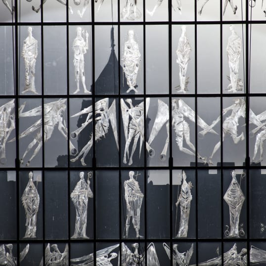 The West Screen is located at the entrance of the New Cathedral. Designed and hand engraved by John Hutton (1906 - 1978) over 10 years and features 66 figures depicting saints and angels.